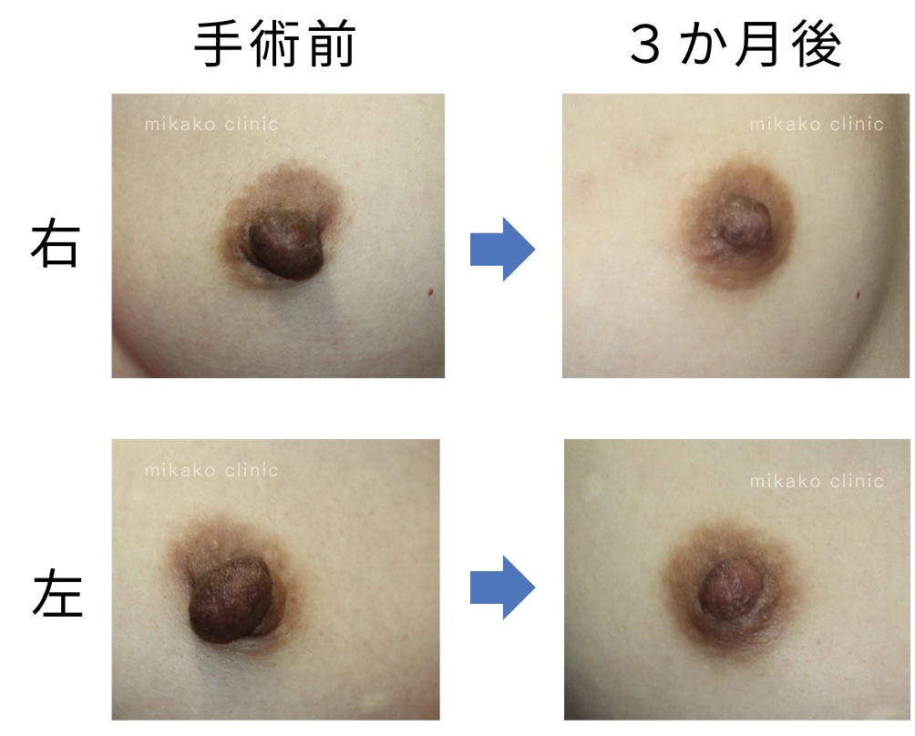 左側は術前に盛り上がっていた乳輪が平らになり、乳頭が綺麗に立ち上がりました。